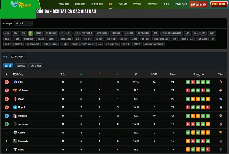 Điều mình thích ở Mitom Live là giao diện của bảng xếp hạng bóng đá Ý cực kỳ trực quan. Không rối mắt, không nhồi nhét dữ liệu dư thừa. Từ số điểm, hiệu số bàn thắng, đến số trận thắng – hòa – thua, tất cả đều được trình bày mạch lạc. Anh em chỉ cần một cú click là có thể chọn nhanh giải đấu mình quan tâm mà không mất thời gian tìm kiếm.